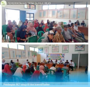 Desa Gumuk Rejo kembali melaksanakan kegiatan penting dalam rangka mendukung kesejahteraan masyarakat serta memberikan apresiasi kepada para kader desa. Pada hari ini, berlangsung kegiatan pembagian Bantuan Langsung Tunai (BLT) serta pembagian insentif kader desa, yang diserahkan secara langsung oleh Kepala Desa Gumuk Rejo, Ibu Eni Feraningsih.