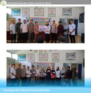 Dalam sambutannya, Kepala Desa Gumuk Rejo, Ibu Eni Feraningsih, menyampaikan bahwa pembagian BLT merupakan program pemerintah yang ditujukan untuk membantu masyarakat yang terdampak secara ekonomi, sekaligus sebagai langkah memperkuat ketahanan sosial di desa. Sementara itu, insentif yang diberikan kepada para kader desa merupakan bentuk penghargaan atas dedikasi mereka dalam mendukung berbagai program pembangunan dan pelayanan masyarakat di Gumuk Rejo.